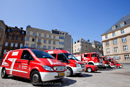 Das knallige Rot des kompletten Fuhrparks stach kontrastvoll in den blauen Himmel.